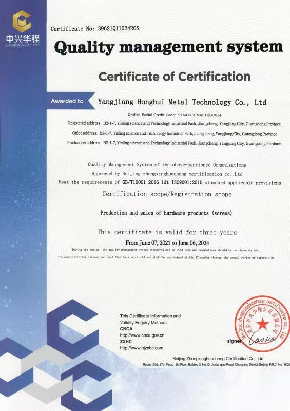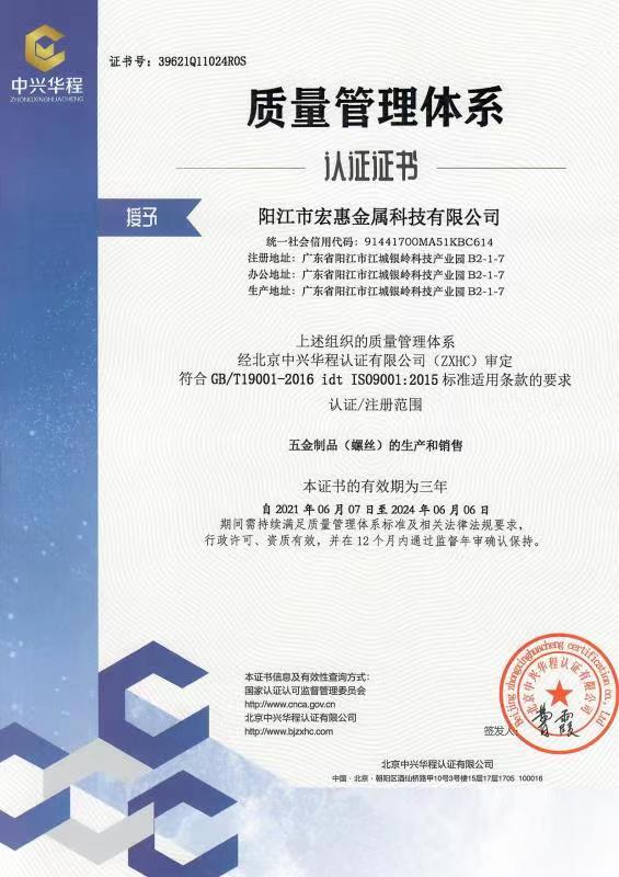 廣東宏惠金屬公司是家20多年一直專注鉆尾螺絲開發(fā)與生產(chǎn)的企業(yè),是國內(nèi)較早做鉆尾的廠家之一,同時也是國內(nèi)專業(yè)開發(fā)生產(chǎn)鉆尾螺絲的企業(yè)之一。 我司地址為于廣東省陽江市江銀嶺科技園距沈海高速白沙出口不到2公里,距陽江高鐵站也只有十余公里交通便利。 公司占地120畝,擁有超500臺套專業(yè)設計 生產(chǎn) 檢測設備。一個超200人的專業(yè)團隊,能夠嚴格按照ISO9001質量體系要求生產(chǎn)符合GB DIN AS3566 ANSI JIS BS等標準的產(chǎn)品,生產(chǎn)銷售各種高品質緊固件系列產(chǎn)品,為中高端客戶提供優(yōu)質服務。也可按照客戶要求設計生產(chǎn)各種鉆尾,年產(chǎn)高品質碳鋼 不銹鋼鉆尾螺絲2萬余噸.在各大客戶的鼎力支持下產(chǎn)品暢銷全國,并遠銷亞 非 拉 歐等地,在這20多年發(fā)展的道路上我司堅持“以質量求生存,以信譽求發(fā)展”的精神理念不斷完善公司體系。
